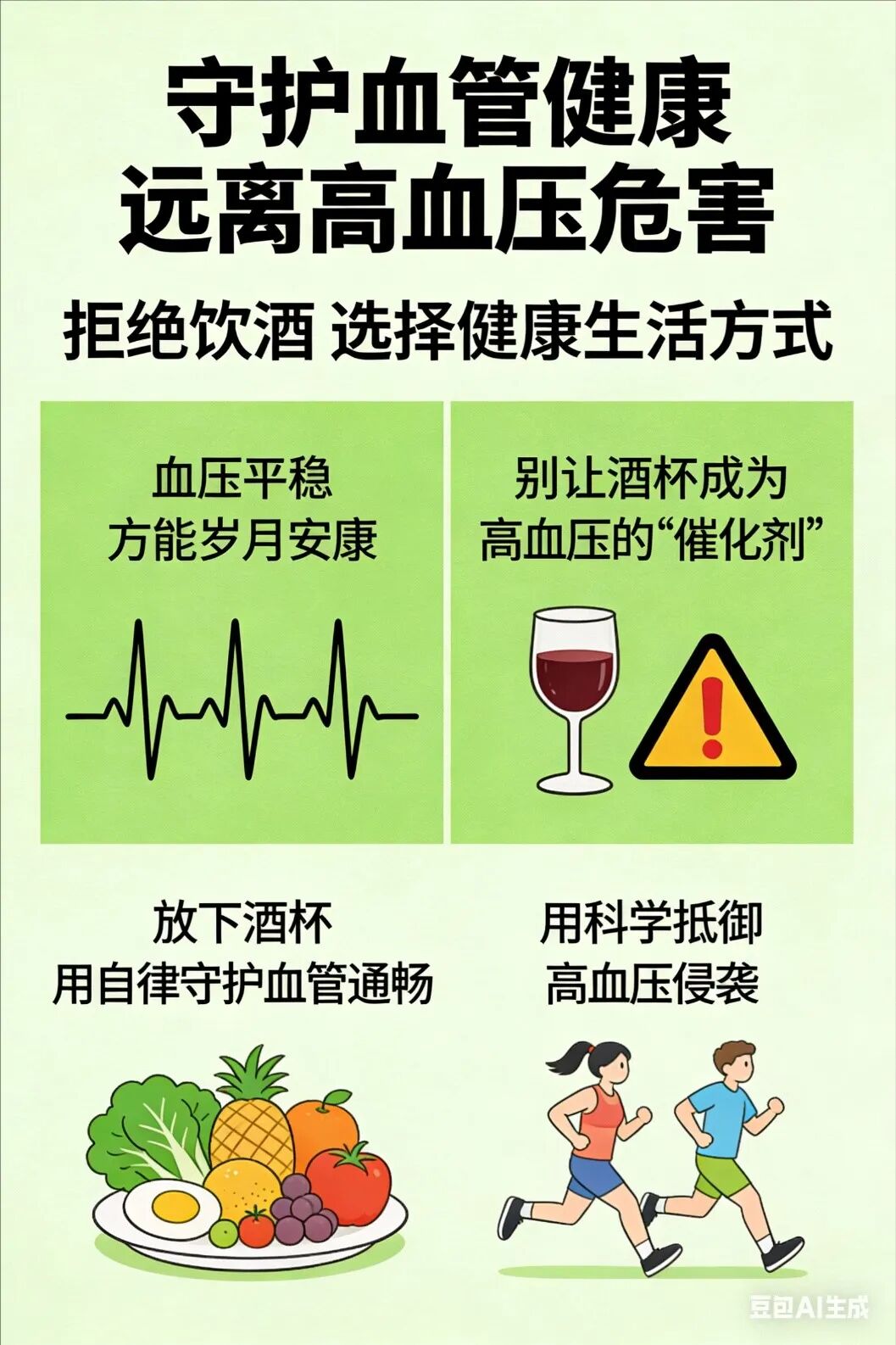 守护血管健康,远离高血压危害,从拒绝饮酒开始。血压平稳,方能岁月安康。别让酒杯成为高血压的“催化剂”,别让一时的放纵透支终身的健康。从今天起,放下酒杯,选择健康的生活方式,用自律守护血管通畅,用科学抵御高血压侵袭,让每一次心跳都平稳有力,让每一段人生都安康顺遂!