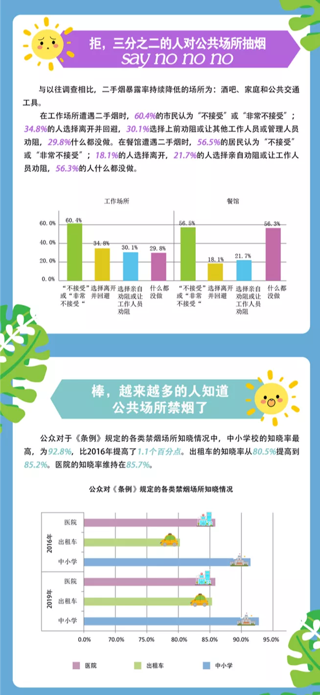 《北京市控制吸烟条例》实施以来,烟民数量有何变化,有多少人想戒烟,公共场所遭遇二手烟暴露后市民态度如何,哪类公共场所禁烟知晓率最高。