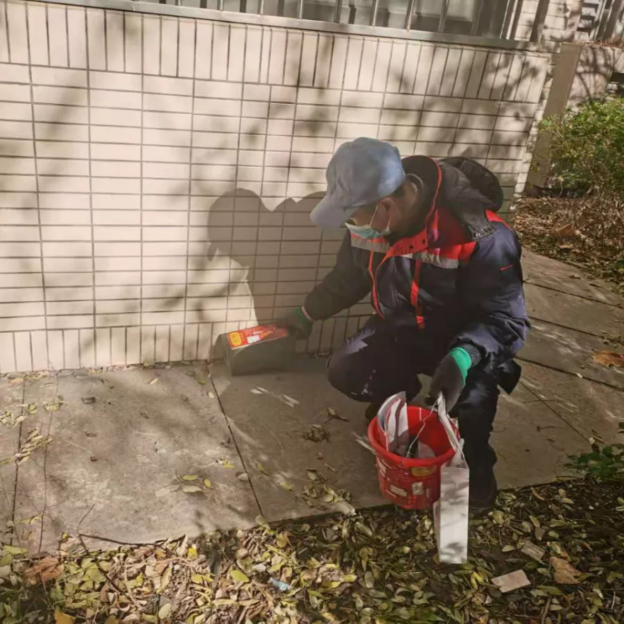 工作人员在消杀作业中,严格按照操作规范进行开展,采用地毯式方法,对小区内的下水道、污水井进行了药物喷洒,对鼠饵站则进行了药物投放及标签更换,并向居民群众宣传除四害工作的重要性。