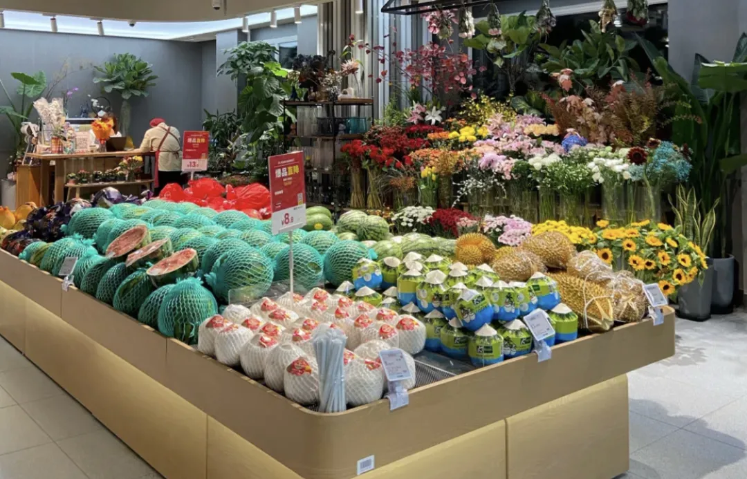 一进门,新鲜的瓜果香味就扑面而来。超市入口处,泰国椰青、金枕榴莲、柚子等水果分门别类地整齐摆放,顶花带刺的黄瓜、绿油油的西蓝花等各色蔬菜都透着新鲜。