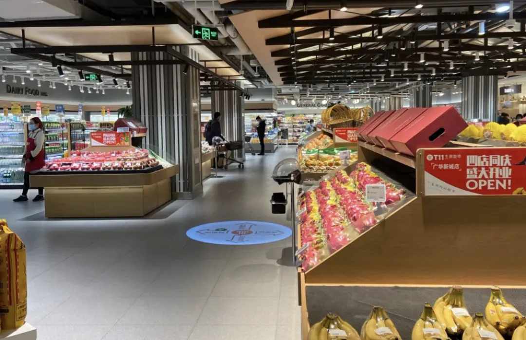 今年9月底正式开业的菜鲜果美精品超市(安苑店)则以“中国风”的建筑风格让人眼前一亮。