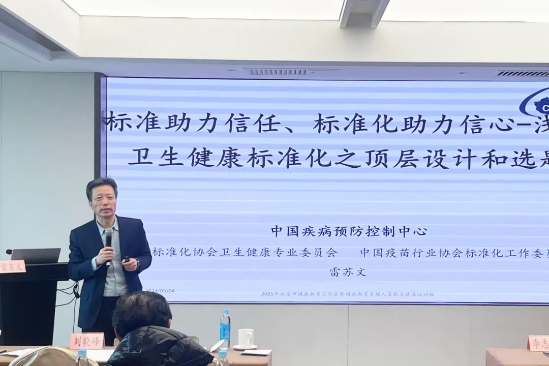 中国疾控中心卫生标准处处长雷苏文为与会人员进行了题为《标准助力信任、标准化助力信心——浅谈卫生健康标准化之顶层设计和选题》的培训,现场与北京市健康教育工作者进行互动交流,对标准申报的设计和选题提供了专业的指导。