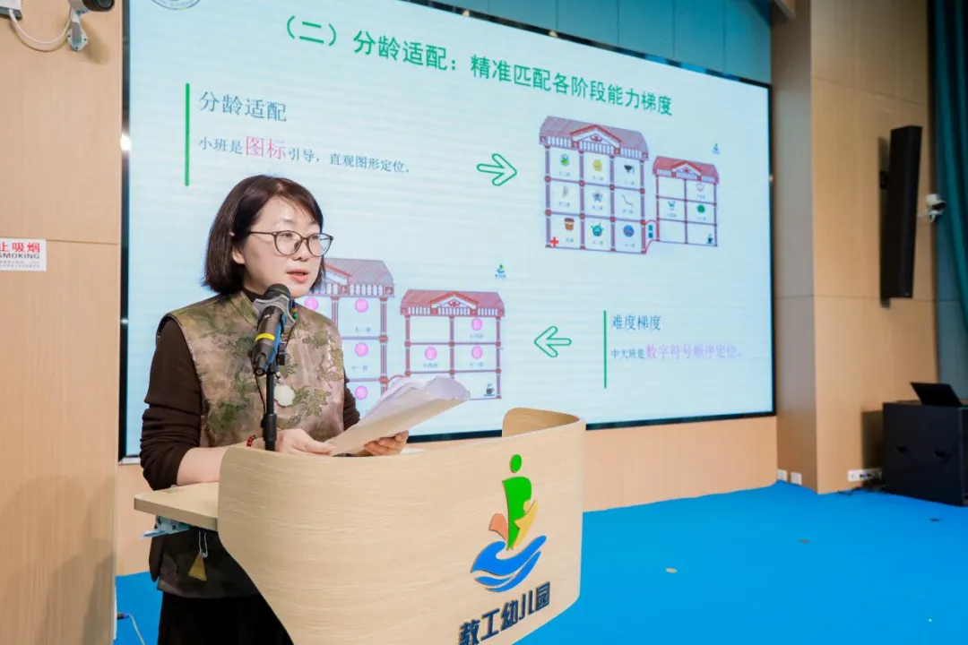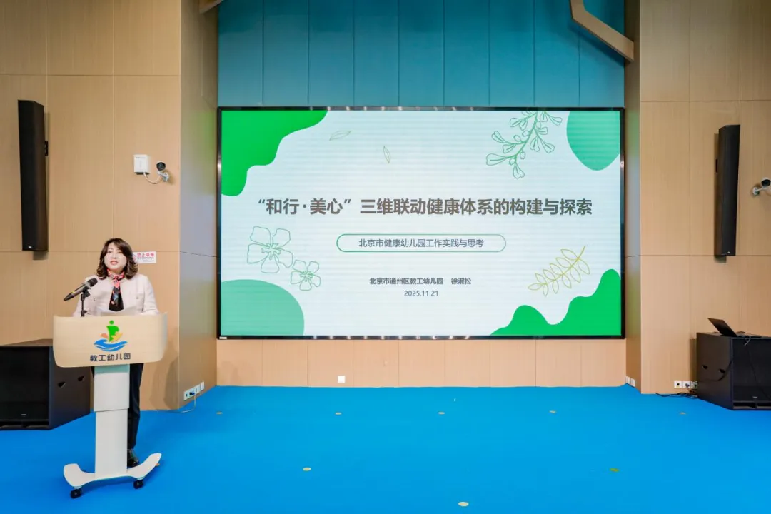 随后,通州区教工幼儿园的徐淑松园长围绕健康幼儿园建设经验做专题分享。杨毓馨副园长详细介绍了园所独创的“健康之星——指北针游戏”。该游戏是园所基于指北针定向户外运动,结合园所场地条件与幼儿年龄特征等改编的园本特色活动,不仅有效延长了幼儿身体活动时长,更有机融入合理膳食、心理健康等健康科普知识,同步提升幼儿语言表达、社交协作与逻辑思维等多方面能力。