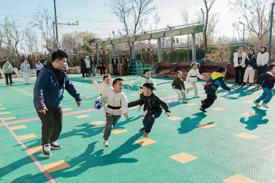 最后,在园所老师的指引下,与会人员分为4组实地参观了幼儿园的健康环境,亲身观摩体验了“健康之星--指北针游戏”,并在户外观看了一场激烈的幼儿“腰旗橄榄球”比赛。孩子们系上腰旗,化身敏捷的小小运动员。进攻方通过传球与跑动,智取巧夺;防守方则眼疾手快,在追逐与闪躲中拔下持球者腰旗。