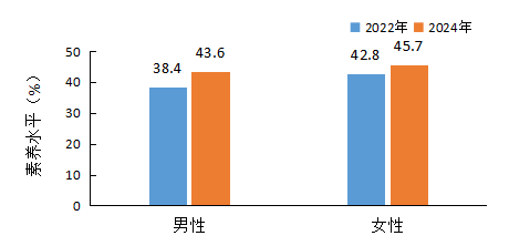 男性健康素养水平由2022年的38.4%上升到2024年的43.6%,女性健康素养水平由2022年42.8%上升到2024年的45.7%。