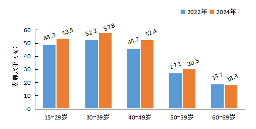 年龄组方面,30-39岁年龄组健康素养水平最高,为57.8%,60-69岁年龄组健康素养水平最低,为18.3%,15-29岁年龄组素养水平为53.5%,40-49岁年龄组素养水平为52.4%,50-59岁年龄组素养水平为30.5%,30岁以上居民的健康素养水平呈现出随着年龄增加而下降的趋势。与2022年相比,15-59岁居民健康素养水平呈现持续上升趋势,其中40-49岁年龄组居民健康素养水平增幅最大,由2022年的45.7%提升到2024年的52.4%。