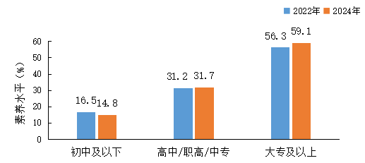文化程度方面,初中及以下文化程度居民健康素养水平为14.8%,高中/职高/中专为31.7%,大专及以上为59.1%,健康素养水平呈现随文化程度升高而增高的趋势。与2022年相比,初中及以下文化程度居民健康素养水平略有下降。