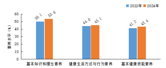 健康素养的三个方面中,基本知识和理念素养最高为53.6%,健康生活方式与行为素养为45.1%,基本技能素养为43.4%。与2022年相比,三方面素养水平均有不同程度的增长,其中,基本知识和理念素养水平增幅最大,由2022年的50.0%上升到2024年的53.6%,其次是基本健康技能素养和健康生活方式与行为素养。