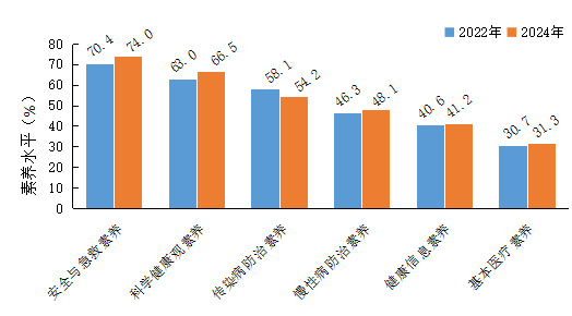 健康素养的六类问题中,由高到依次为:安全与急救素养74.0%,科学健康观素养66.5%,传染病防治素养54.2%,慢性病防治素养48.1%,健康信息素养41.2%,基本医疗素养31.3%。与2022年相比,除传染病防治素养外,其余五类健康素养水平均有不同程度的增长,安全与急救素养水平的增幅最大,由2022年的70.4%上升到2024年的74.0%。