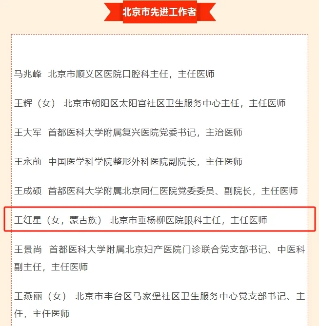 北京市垂杨柳医院眼科主任、主任医师王红星获评“北京市先进工作者”称号。