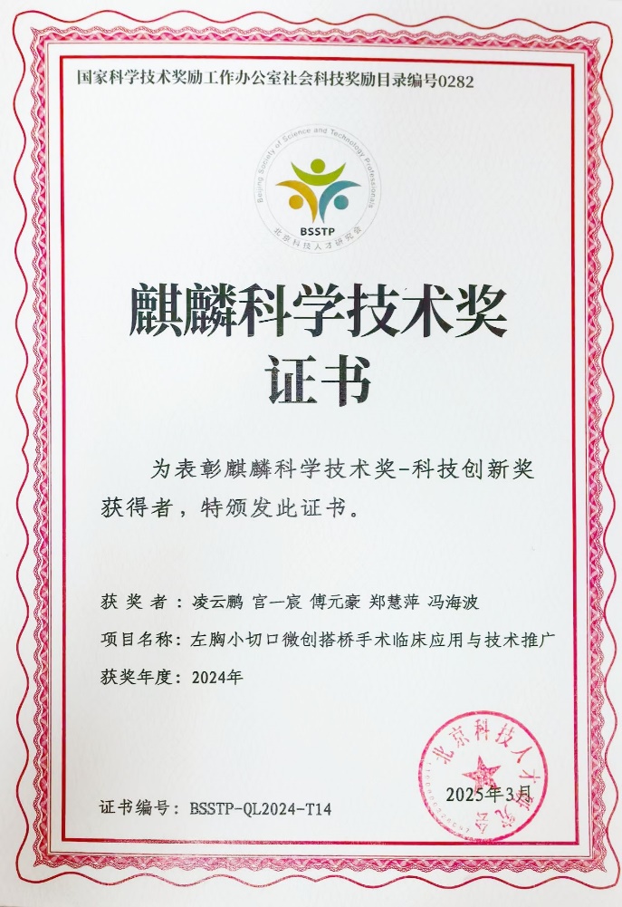 2025年7月12日,北京科技人才研究会在麒麟科技创新论坛国际会议上举行“麒麟科学技术奖”颁奖仪式。北京大学第三医院心脏外科凌云鹏教授团队的“左胸小切口微创冠脉搭桥手术临床应用与技术推广”项目和眼科李学民教授团队的“动态视功能检测训练平台”项目荣获麒麟科学技术奖-科技创新奖。