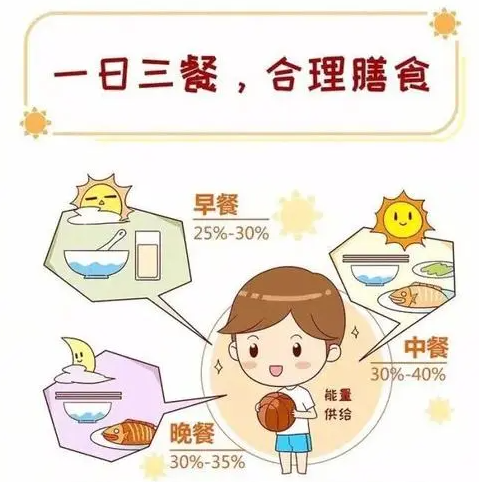 孩子要规律吃好三餐。早餐一定要吃,并且要吃好。关于一日三餐有个建议量,早餐提供的能量应该占全天能量的25%-30%,午餐30%-40%,晚餐30%-35%。要注意食物品种的多样,建议每天能摄入12种以上的食物,每周25种以上,包括谷类食物、动物性食物、蔬菜水果、奶、豆制品、坚果等。