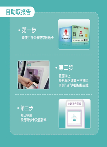 患者只需关注“京医通”微信公众号,在页面下方选择“就诊服务报告查询”,绑定社保卡或京医通卡,通过账号认证和身份认证后,即可查看已经生成的检验报告结果。