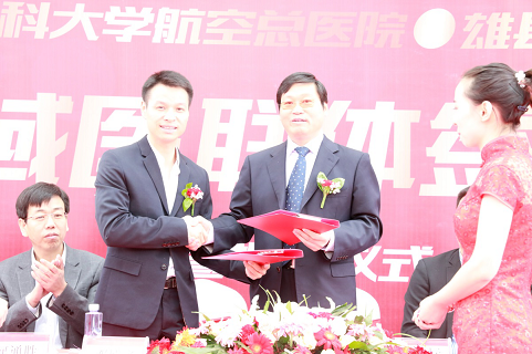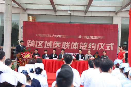 10月17日,在喜迎党的“十九大”召开之际,中国医科大学航空总医院党委书记兼院长王文标率专家医疗队赴京畿福地、雄安新区所辖地,与雄安新区雄县济康医院组建京津冀跨区域医疗联合体并出席签约揭牌仪式。