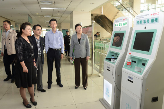 吕一平一行首先查看了北京佑安医院门诊大厅建卡中心及挂号收费情况,重点关注了现场自助机挂号、取号、缴费的使用情况,以及北京佑安医院为配合非急诊全面预约工作,逐渐减少现场挂号窗口,由职能科室工作人员、安保人员及患者服务中心导医人员共同作为志愿者,在大厅引导并协助患者使用自助系统挂号缴费。