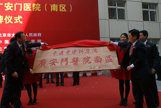 揭牌仪式由区委常委、常务副区长谈绪祥主持。市中医药管理局局长赵静宣读了《关于成立中国中医科学院广安门医院(南区)的决定》。区长李长友、广安门医院院长王阶分别代表区政府、广安门医院签订了委托管理协议书。卫生部副部长、国家中医药管理局局长王国强,中国中医科学院党组书记王志勇,副市长丁向阳,区委书记、开发区工委书记林克庆为中国中医科学院广安门医院(南区)揭牌。