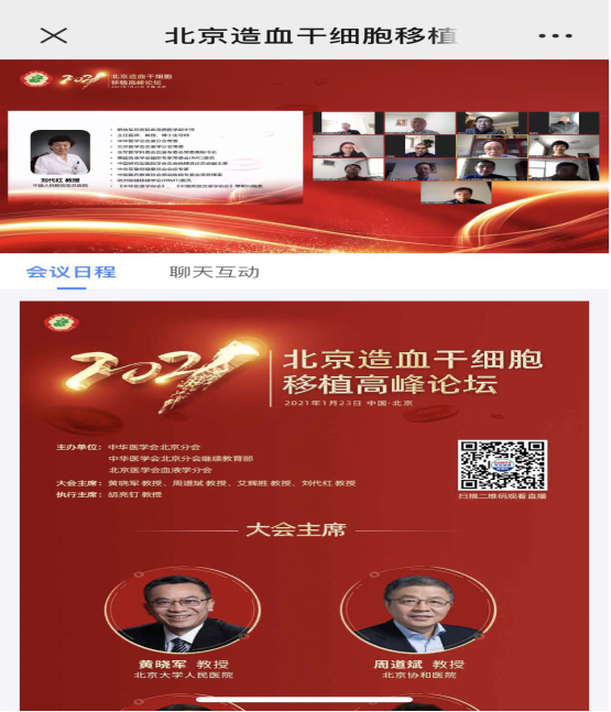 2021年 1 月 23 日,由中华医学会北京分会主办,中华医学会北京分会继续教育部、解放军总医院第五医学中心联合承办的”2021年北京造血干细胞移植高峰论坛”成功举办。此次会议采用线上直播形式呈现,网络隔空互动,众多与会专家一道就造血干细胞移植领域的最新学术成果、新药及治疗手段等热点问题进行了深入探讨和学习。