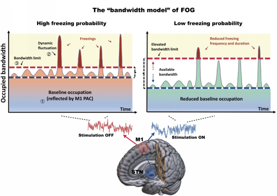 研究团队通过记录并分析16例伴有冻结步态的PD患者丘脑底核和运动皮层神经元放电特征,并通过光学动作捕捉系统实时量化步态指标,发现冻结的发生与初级运动皮层beta-gamma频段相位振幅耦合的异常升高相关。STN-DBS能显著降低该异常耦合并同时改善步态冻结症状。额外的双重任务认知负荷试验显示,行走中认知功能与运动功能竞争性抢占运动皮层信息处理资源,STN-DBS整体提高了运动皮层信息处理能力上限。基于上述结果提出的“带宽模型”,首次将运动功能受损、认知负荷以及电刺激对步态障碍的干预效果在同一个模型中有机融合,该模型对闭环DBS疗法的优化及行走脑机接口系统的研发提供重要数据支撑。