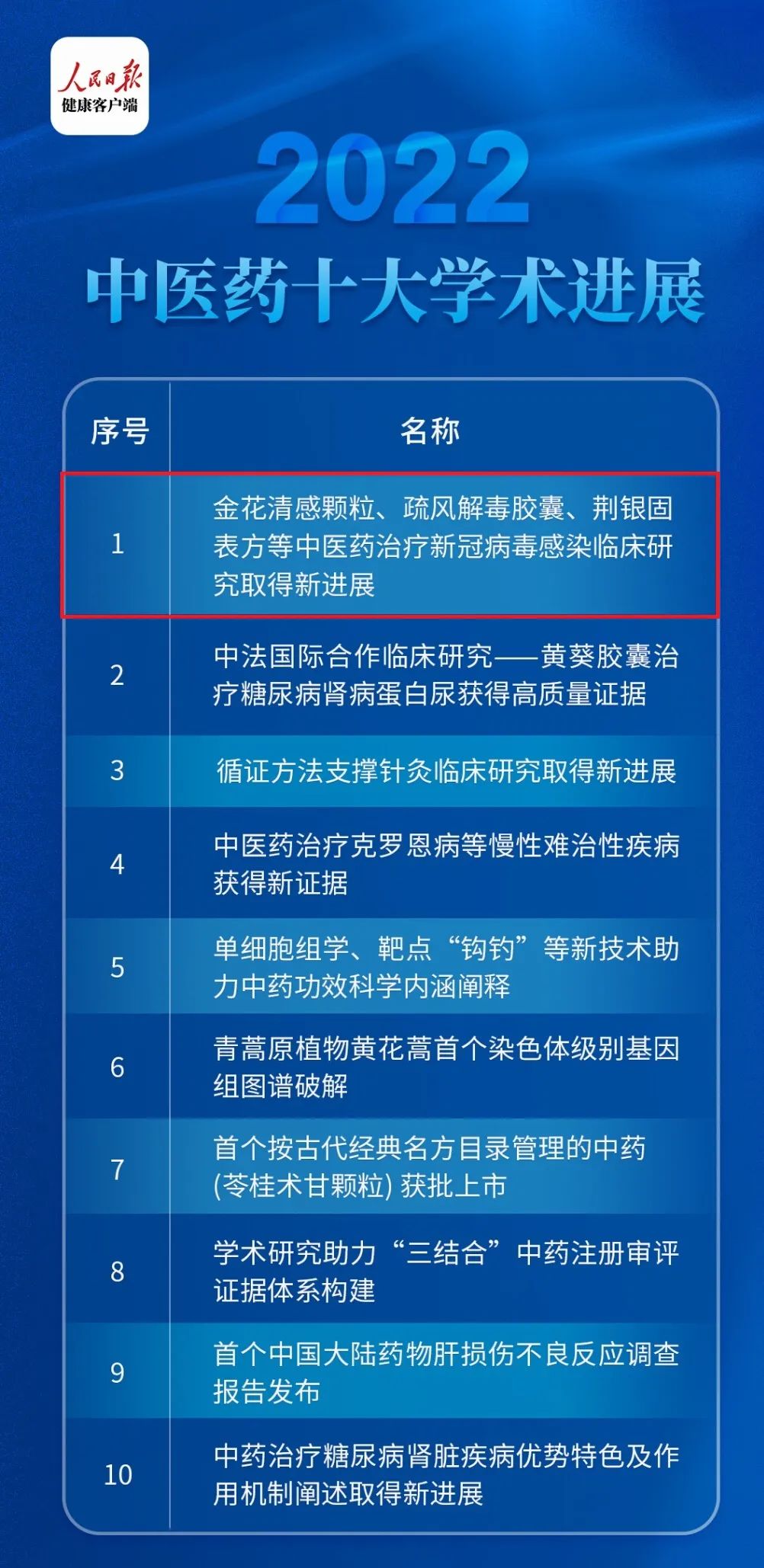 近日,2022年度中医药十大学术进展发布,首都医科大学附属北京中医医院刘清泉教授团队研究成果“金花清感颗粒治疗新冠病毒感染”入选。