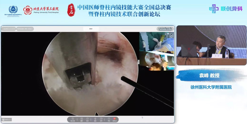 在脊柱内镜技术创新与发展专题,孙垂国从个人由传统脊柱开放手术医师转变为脊柱内镜手术医师的经历,分享了传统脊柱开放技术与内镜技术的对立与统一。北京大学第三医院海淀医院(北京市海淀医院)蒋毅教授回顾了自己从事脊柱微创技术10余年的心路历程;青岛大学附属医院马学晓教授介绍了OLIF技术与脊柱内镜技术的各自特点;广东省中医院陈博来教授介绍了经皮腰椎下关节入路单通道内镜下融合技术的临床应用。在手术直播环节,徐州医科大学附属医院袁峰教授讲解、孙玛骥手术演示了一例经皮脊柱内镜创新型器械治疗腰椎管狭窄症,该院与UninTech联合创新研发的专利产品——脊柱内镜技术透视工作通道首次亮相。