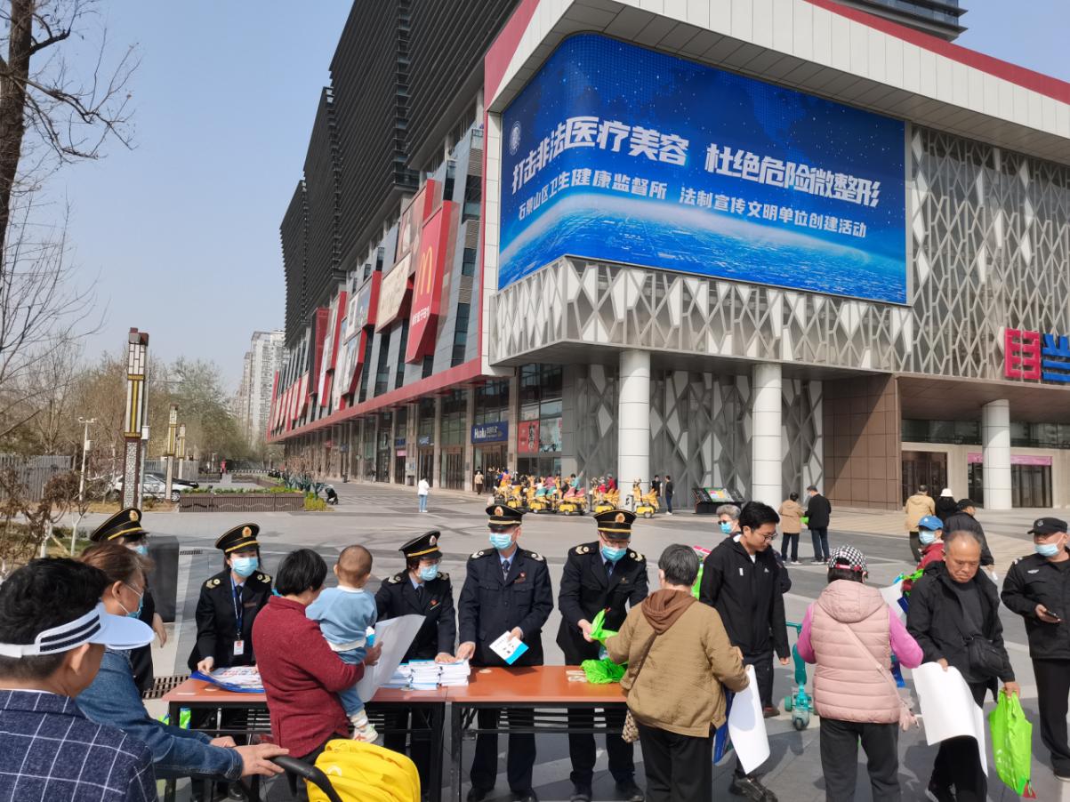 随着城市建设的发展,城乡结合部减少,一些小型的“微整形”进入了居民楼、商住两用楼宇和写字楼等隐匿场所,为有效打击“非法医美”,提升公众知晓度和社会宣传层面,3月30日,石景山区卫生健康监督所联合当代物业在石景山区当代广场开展“打击非法医美”宣传普法活动。