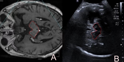 图B为患者黑质超声显像,可清晰显示中脑结构(红线标识)以及黑质回声增强;