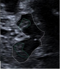 图B局部放大,可清晰显示黑质回声增强范围(绿线标识),测量其面积。