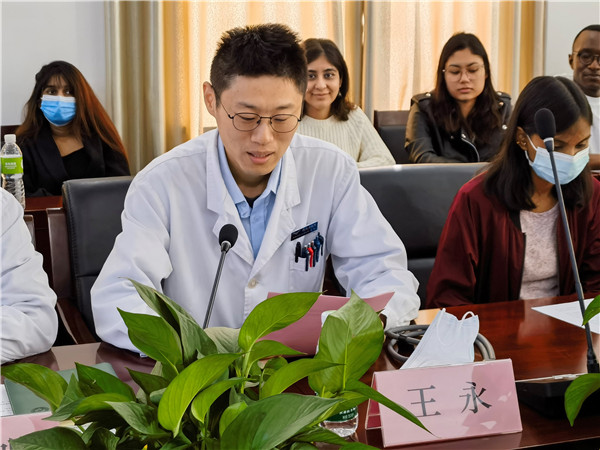 紧接着是我院彭定琼院长讲话。她首先代表全院职工对2020级8班留学生们的到来表示热烈欢迎。然后,她介绍了我院的本科生教学发展情况,她讲到,我院教学经历比较长,培养了一届又一届本科生,教学经验丰富,取得了不错的成绩,医院全体教职员工会为大家做好服务!她希望全体同学能尽快适应医院的学习环境,互助友爱,相互尊重,在今后的行医生涯中,培养高超的医术,高尚的医德,高贵的医品,做心中有爱,眼中有光,肩上有责的好医生。恪守医德,仁爱为先,努力学习,不断进步,早日成为一名优秀的医者。她寄语全体新同学,医学道路步步维艰,需要毕生的艰苦修炼,既然选择了医学,就要扶危济贫,救死扶伤,既然选择了医学,就是选择了奉献,远离诱惑和喧嚣,要做一个纯粹的医者。医学知识日新月异,一生都需要不断学习,不断摄取,不断成长。大家来自世界各地,做好各国之间传递文化,传承文明,宣传中国的使者,为世界和平做出贡献。衷心感谢医学部国合处多年来对我院本科生教学的大力支持帮助与关心,最后她衷心祝愿同学们身体健康,学业有成!