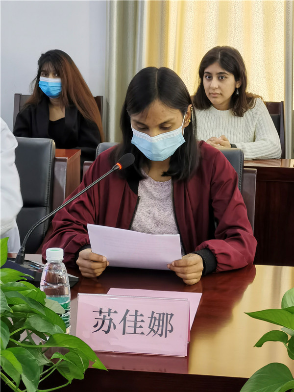 随后,2020级8班留学生代表,来自尼泊尔的苏佳娜同学发言,她首先表示了对民航临床医学院领导、留办领导及老师们的感谢,代表同学们表示很荣幸能够来到民航临床医学院学习,在疫情期间,看到中国人民团结一致,白衣战士无所畏惧逆行而上,大家众志成城,用生命去捍卫家园,共抗疫情,感到非常的震撼与感慨,留下了深刻的印象。更加坚定了做一名医生的决心!希望大家能珍惜来之不易的学习机会,坚持救死扶伤、治病救人的崇高理想,为实现改善和维护所有人的健康和福祉而努力奋斗。