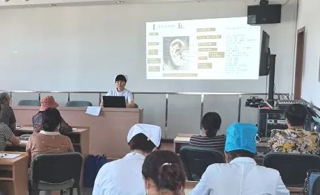 培训中,中医医院医技党支部孙燕英以《耳穴压丸》为题,讲解了耳部结构图、耳穴概念,耳穴压丸的适应症、禁忌症、临床应用等相关知识,结合自身临证经验,就选穴定位的操作要点、注意事项、按压治疗方法进行了示范讲解,并与学员们进行现场演练互动,手把手进行操作指导,在场学员学习氛围浓厚。