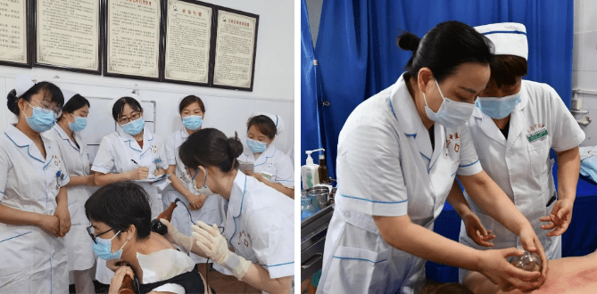 保健病房主管护师王碧君进行电热砭石技术指导,中医护理门诊护师杨燕进行拔罐技术指导。
