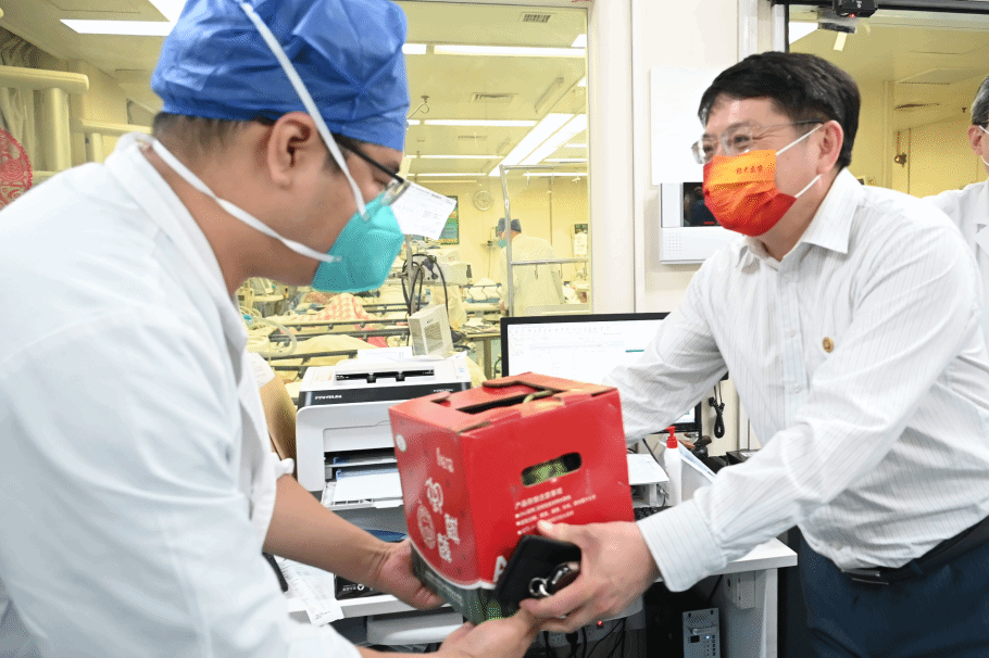 随后,龚旗煌校长等领导来到急诊看望医务人员。龚校长走进急诊抢救室,对正在工作的医护说:“你们非常不容易,大家辛苦了!”急诊科主任马青变汇报了急诊学科特色、抢救室运转情况等,并表示一定守好“前线”,全心全意为患者服务。龚校长对急诊医务人员的辛勤付出表示肯定,并为他们送上慰问品。