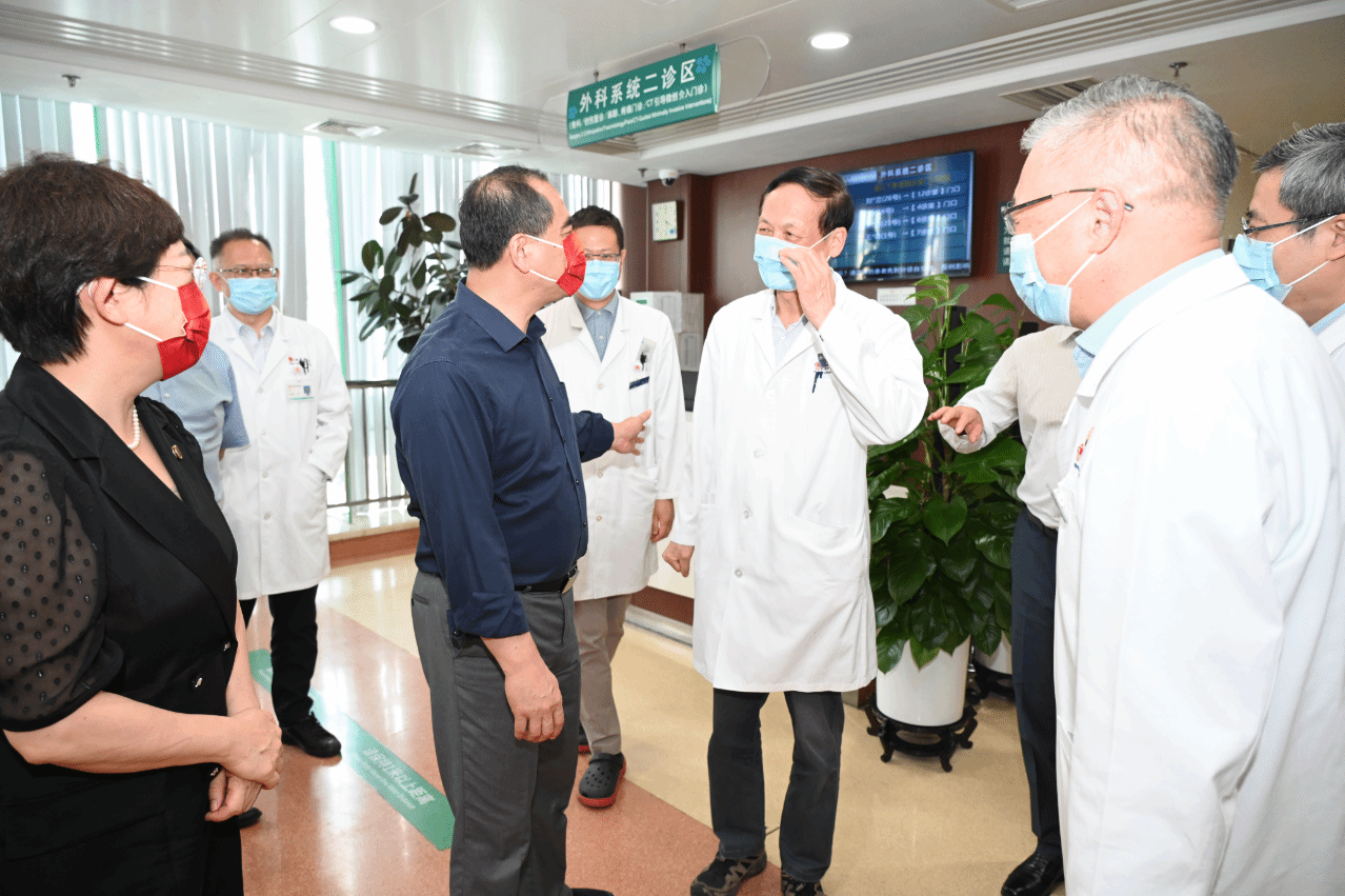 龚旗煌校长等领导首先走进位于门诊二层的外科二诊区,看望刚刚出完门诊的医务人员,感谢他们保障人民群众健康,为人民服务。在骨科诊区,龚校长与刚出完门诊的全国人大代表刘忠军教授亲切交谈,询问了骨科门诊量等相关情况。龚校长向在岗位上坚守,默默付出的医务人员表示慰问,并与医护在分诊台前合影留念。