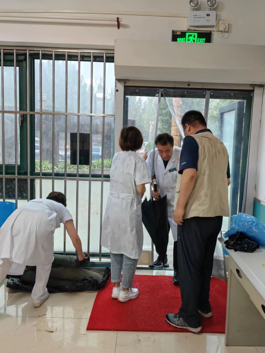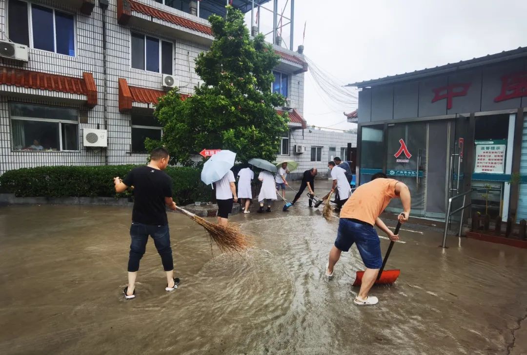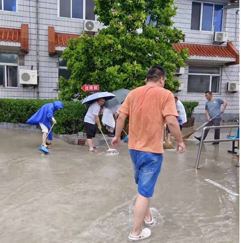北京广阳博海医院组织在院医务及后勤工作人员对院内积水进行清理。