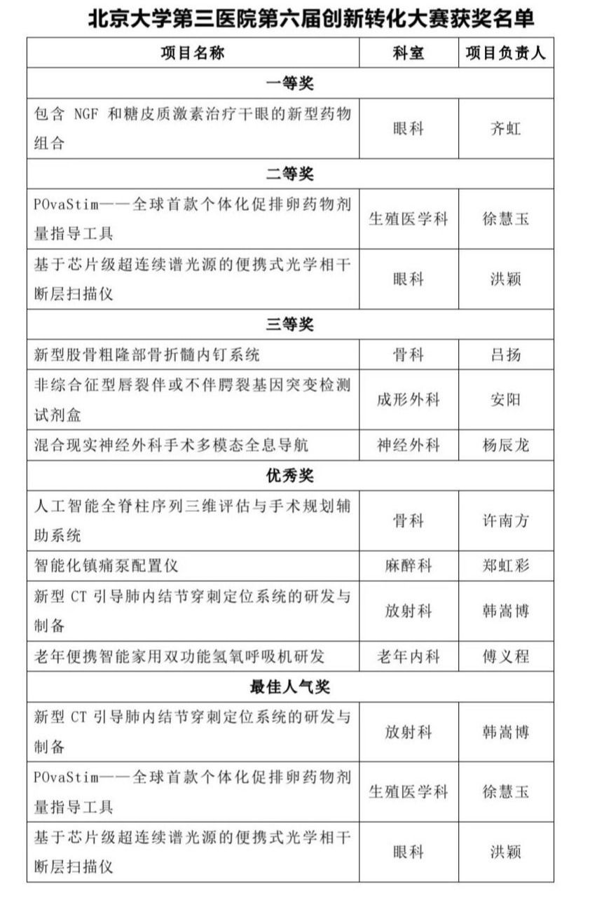 北京大学第三医院创新转化大赛为医院促进创新、推广成果搭建平台,为社会资源寻找创新技术、挖掘潜力项目嫁接桥梁,在过去5年共推选66个项目登台展示,有效推广率达到50%。今年,全院参与转化大赛的热情进一步提高,共有来自25个学科的51个项目报名参赛。经过层层遴选,来自骨科、眼科、成形外科、放射科、老年内科、麻醉科、神经外科、生殖医学科的10个项目进入决赛,进行了精彩的路演展示。来自政府、高校、器械审评、企业投资等不同领域的11位专家坐镇评委席,为项目打分、点评。经过激烈角逐,各个奖项逐一揭晓(见下表)。