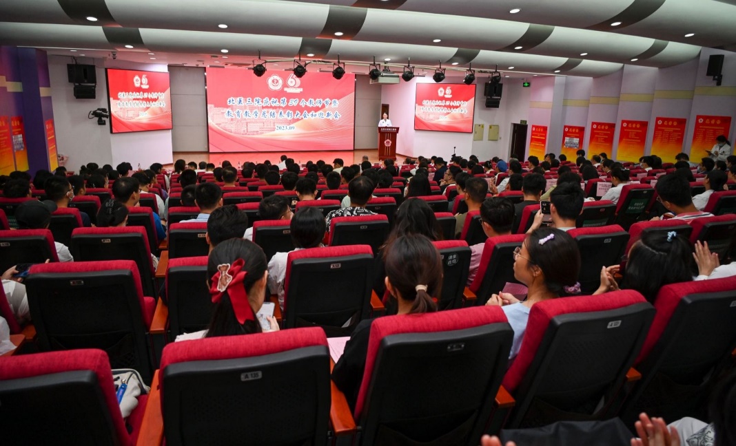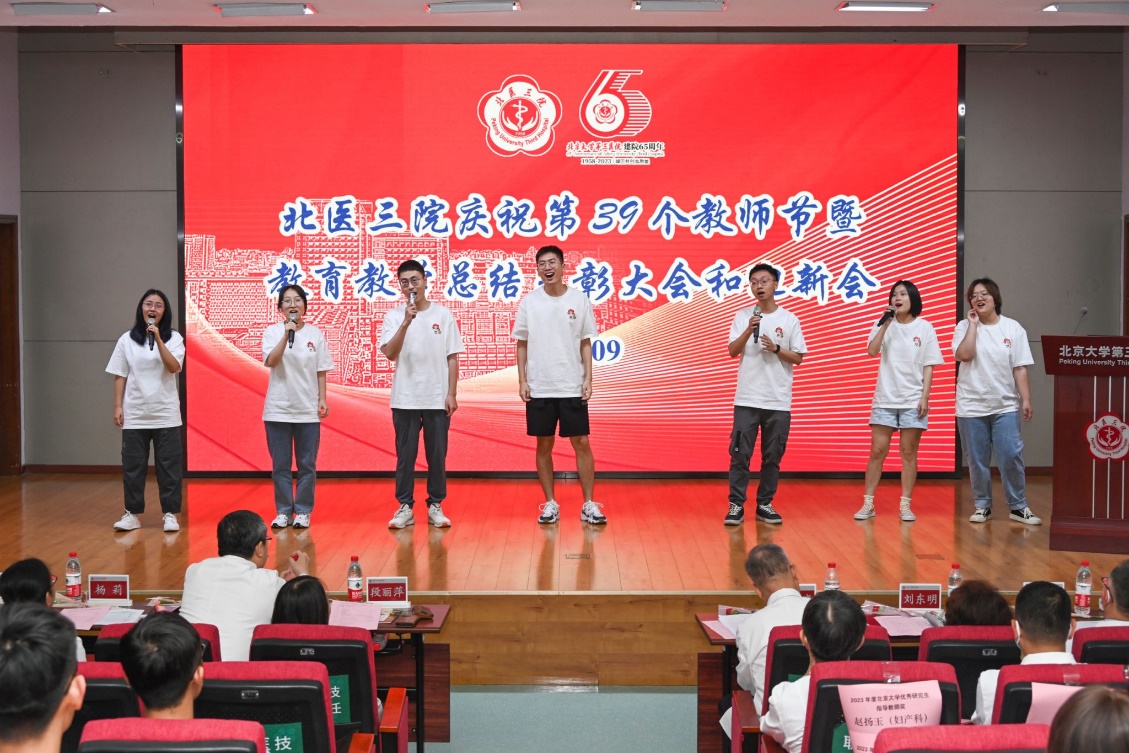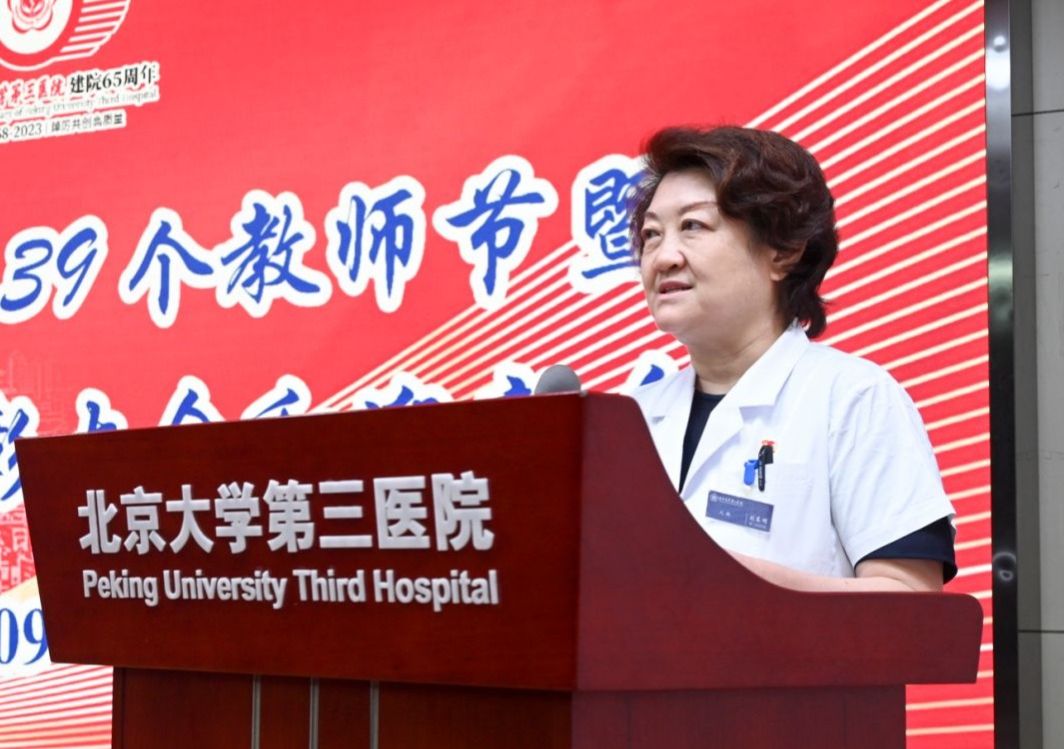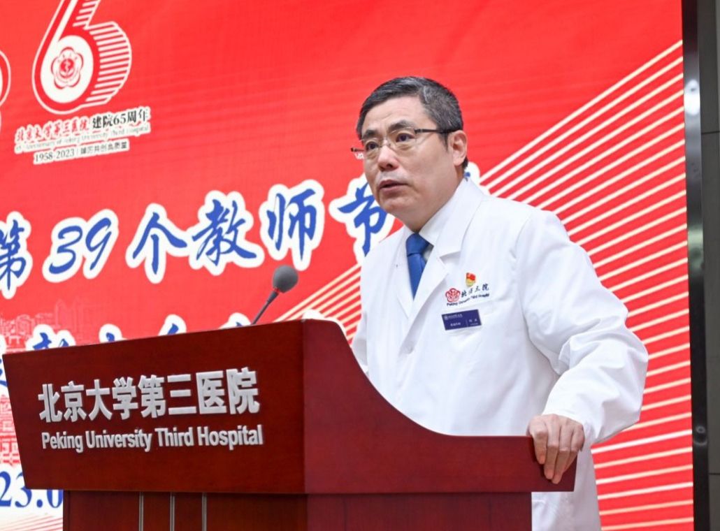 2023年9月7日,北京大学第三医院庆祝第39个教师节暨教育教学总结表彰大会和迎新会在科学报告厅举行。北京大学医学部副主任段丽萍,北京大学第三医院党委书记金昌晓,院长付卫,党委副书记刘东明,党委副书记、纪委书记杨莉,副院长沈宁、宋纯理、唐熠达出席会议;医院教学管理委员会资深专家代表、各科室教学主任、教学秘书、教学骨干,导师代表,纵向班班主任,教育处全体老师,以及2023级研究生、规培生新生等共300余人参会。表彰会由副院长沈宁主持。