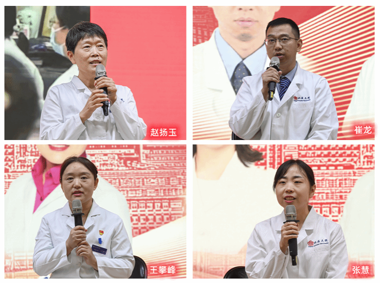 本次表彰会特别邀请到4位优秀教师代表,分别从本科生带教、护理教学、临床教学管理和导师引领四个方面分享教学感悟。作为广受学生欢迎和评估专家认可的本科生优秀指导教师,儿科张慧老师分享了自己快速从一名医生转变为优秀带教老师的经验和感悟。作为医疗卫生系统的一支中坚力量,无论何时都有广大护理工作者默默的奋战和无私的付出。护理部王攀峰老师从护理工作者的另一重身份,用“传承、立体、幸福”三个词总结了自己多年来三全育人的亲身经历。作为大外科的教学副主任,崔龙老师每年都要组织协调上百名住院医师的轮转、培训和各种考核。他认为教学意识和教学创新是教学管理的基础和动力源泉,同时也从医学教育者的角度为大家诠释了“有时治愈,常常帮助,总是安慰”的另一种内涵。研究生导师肩负着为国家培养高层次创新人才的重要使命。2023年度北京大学优秀研究生指导教师、妇产科赵扬玉老师认为,作为一名合格的导师,首先要有扎实的学识,“想要给学生一碗水,自己就要具备一潭水”。同时,赵老师秉承“挑得起”、“敢于战”、“善于战”的教学理念,培养学生们在挑战中成长,在团队协作中进步。
