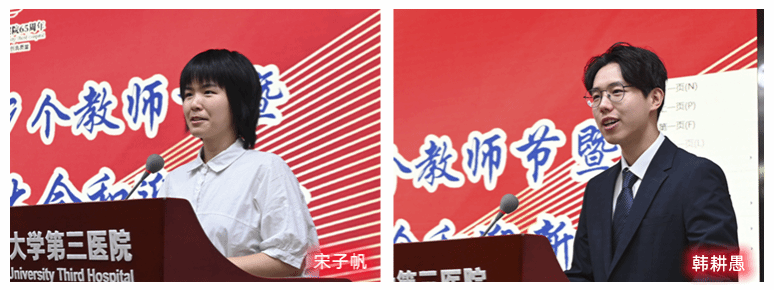 2023级研究生宋子凡和2023级规培生韩耕愚作为新生代表发言。他们代表全体同学向辛苦付出的老师们表示感谢,表示非常幸运能够加入北京大学第三医院大家庭,在医学生到医生的成长道路上,必将努力践行医者初心使命,与党同心、同向、同行,传承“团结、奉献、求实、创新”的院训精神,不惧风雨、勇挑重担,让青春绽放在党和人民最需要的地方。