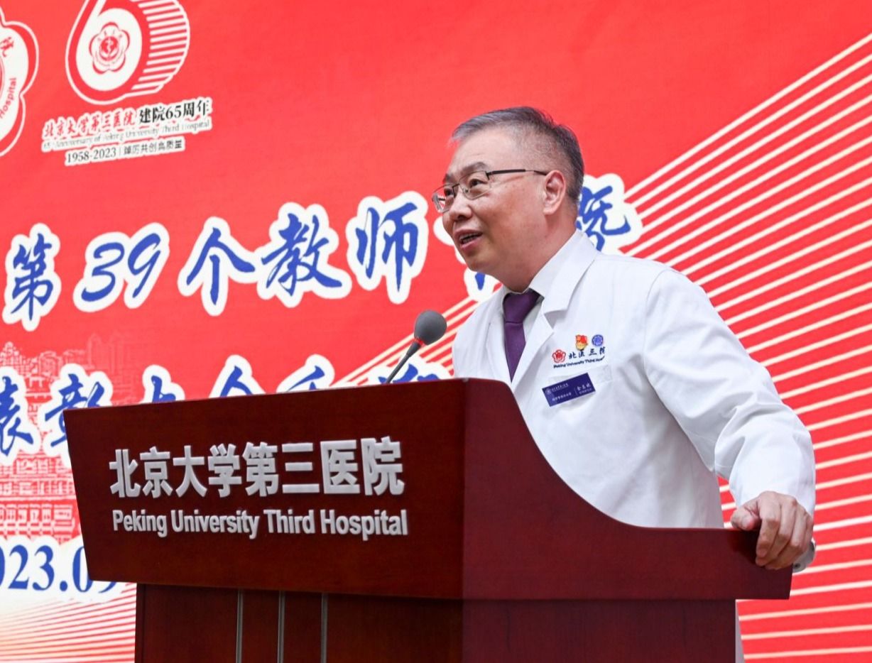 付卫院长致辞,他首先向加入三院大家庭的250名研究生、87名规培生同学们表示最热烈的欢迎,向全院教师致以最诚挚的节日祝福和衷心感谢。党的十八大以来,以习近平同志为核心的党中央高度重视卫生健康和教育事业,把人民健康和教育都摆在了优先发展的战略位置。而医学教育,与教育强国和健康中国战略都紧密相关。北京大学第三医院经过65年的发展,已经进入发展的快车道,同学们成为北京大学第三医院大家庭的一员既是幸福的,也是充满挑战的。未来一年,医院将成立医教协同办公室,深化医教协同,使医教协同走深、走实。同时,进一步加大教学的投入,注重教师的培养和激励,全面提升医学人才培养质量,为推动医学教育事业的发展做出的贡献。