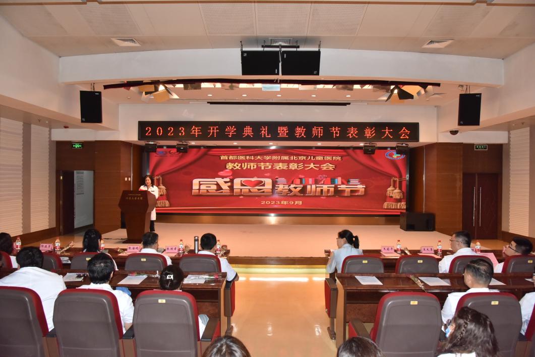 2023年9月10日是第39个教师节,也是党的二十大召开后的第一个教师节,今年的主题是“弘扬高尚师德,潜心铸魂育人”。9月5日下午,在教师节来临之际,首都医科大学儿科医学院2023年开学典礼暨教师节表彰大会在北京儿童医院门诊楼12层报告厅隆重召开。首都医科大学教务处副处长马凌教授;首都医科大学附属北京儿童医院院长、首都医科大学儿科医学院院长倪鑫教授;首都医科大学附属北京儿童医院党委书记、首都医科大学儿科医学院党委书记张国君教授;专职党委副书记、纪委书记张海鸥,副院长李巍,总会计师邓亚芳,工会主席王爱华,内科教研室名誉主任钱素云,内科教研室副主任郭琰,外科教研室副主任王大勇教授,护理部副主任迟巍、刘丽丽,以及研究生导师、临床教师、新入学研究生及护理学生等200余人参加会议。会议由教育党总支副书记、教育三党支部书记严晗主持。