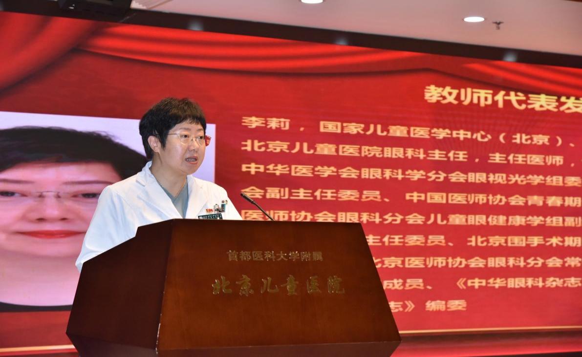 眼科主任李莉教授作为教师代表发言。李莉教授以自身从医31年的经历出发,生动展现了新时代医生的优良品格,教导同学们练就仁爱之心、持续学习能力、勤奋踏实等重要品质。她说:“医生拥有独特幸福与成就感,相信未来的你们终会体会到这种纯粹的快乐。患者需要的永远是医生发自内心的关怀。”最后,李莉教授祝福全体同学在儿科医学院这个新的起点扬帆起航,成为富有担当的新一代儿医人,成为国家的栋梁之材。
