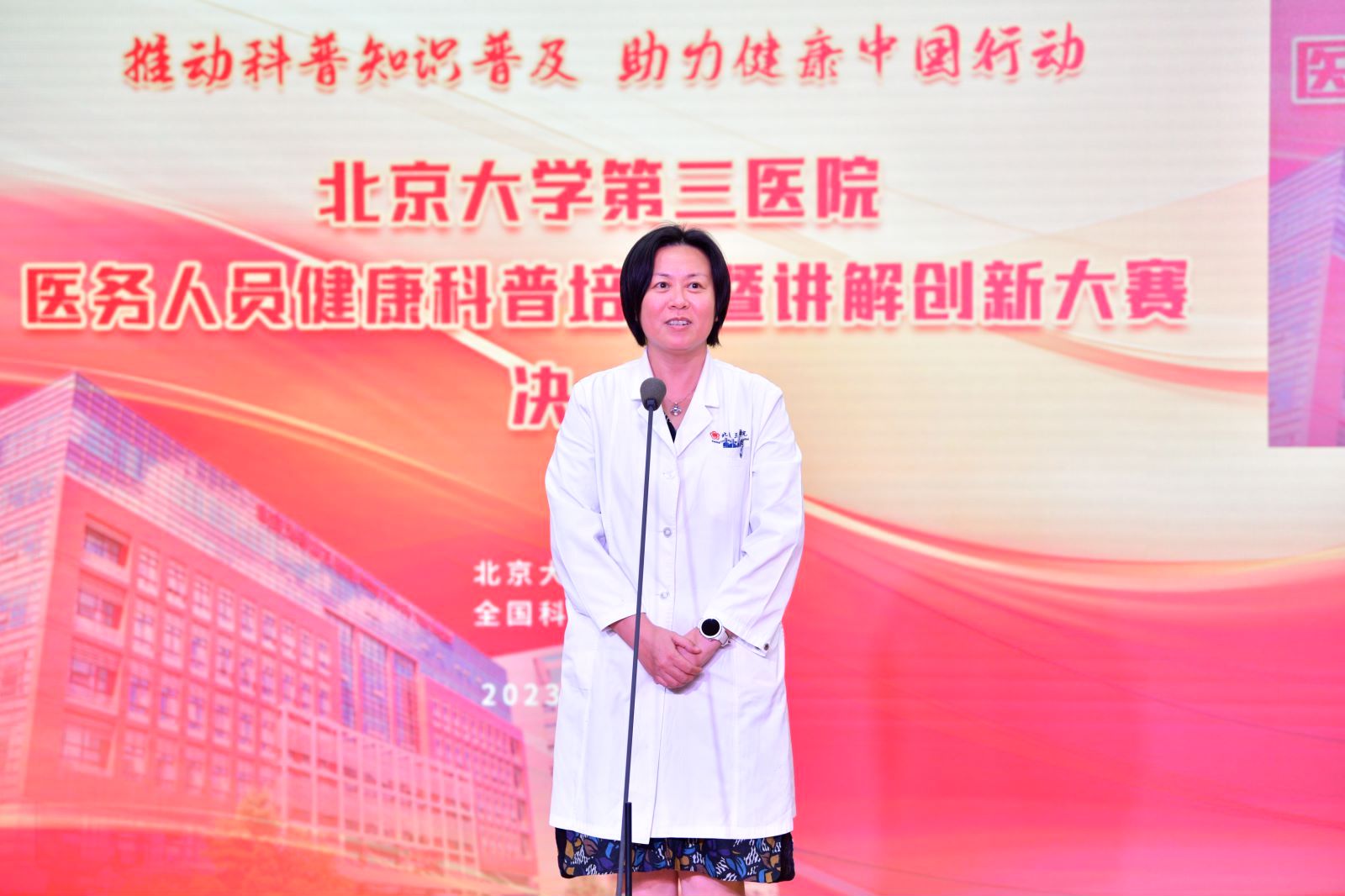 正值建院65周年之际,为全面落实“健康中国”建设及《“健康北京2030”规划纲要》,提升医务人员健康教育水平,挖掘、培育和储备健康科普人才,2023年9月18日下午,北京大学第三医院医务人员健康科普培训暨讲解创新大赛决赛在科学报告厅举行。