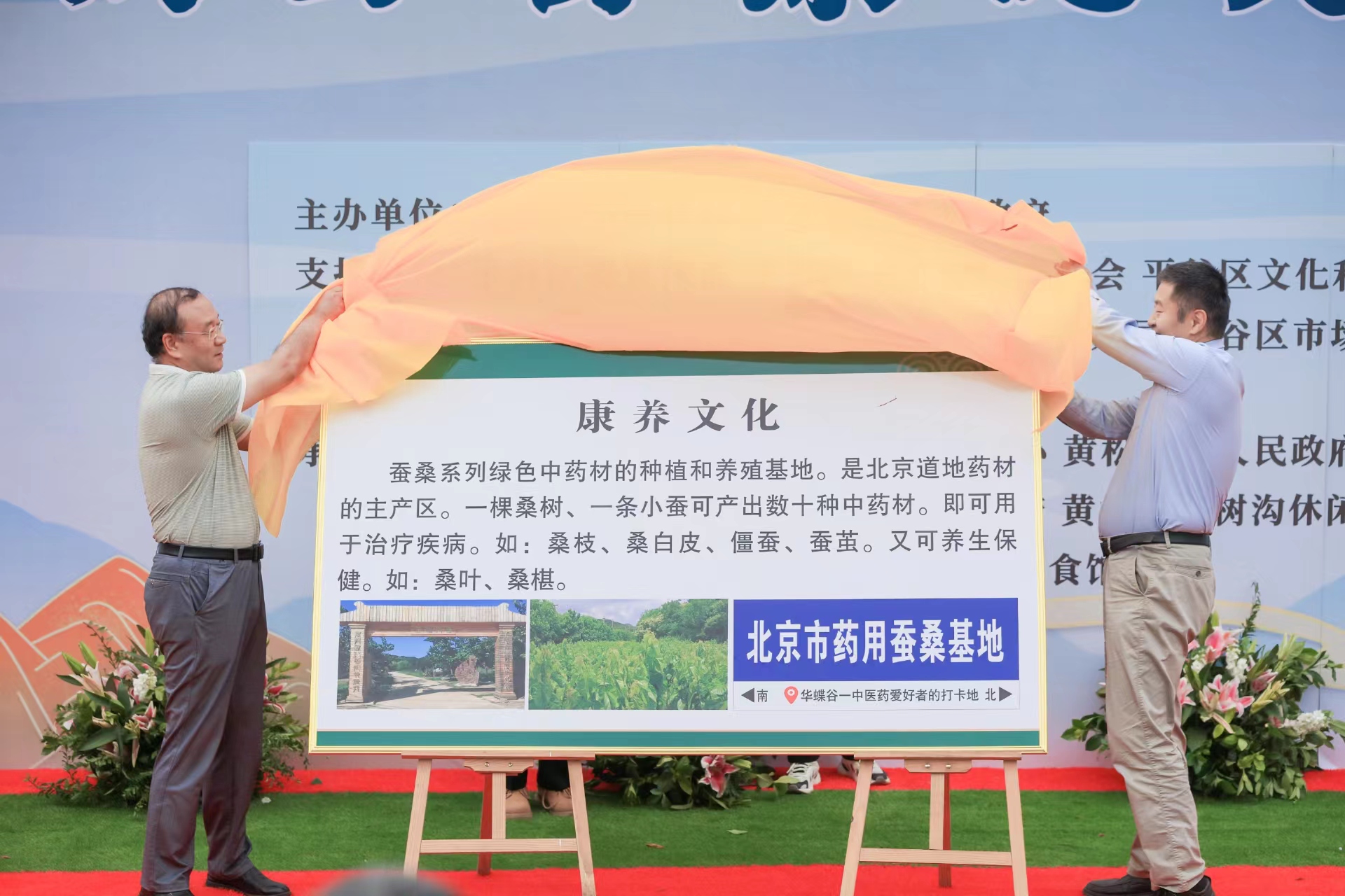 平谷区卫健委副主任张友为北京药用蚕桑基地授予“康养文化打卡地标识”。