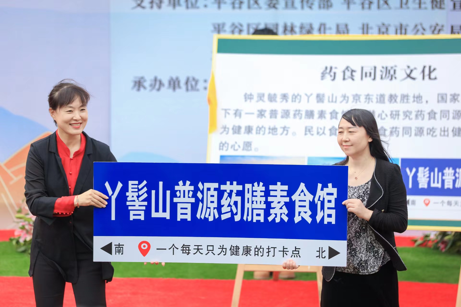 刘家店镇政府党委书记逯艳敏、丫髻山普源药膳素食馆赵丽芳经理一起为药食同源文化揭牌,并对药食同源文化建设情况进行介绍。