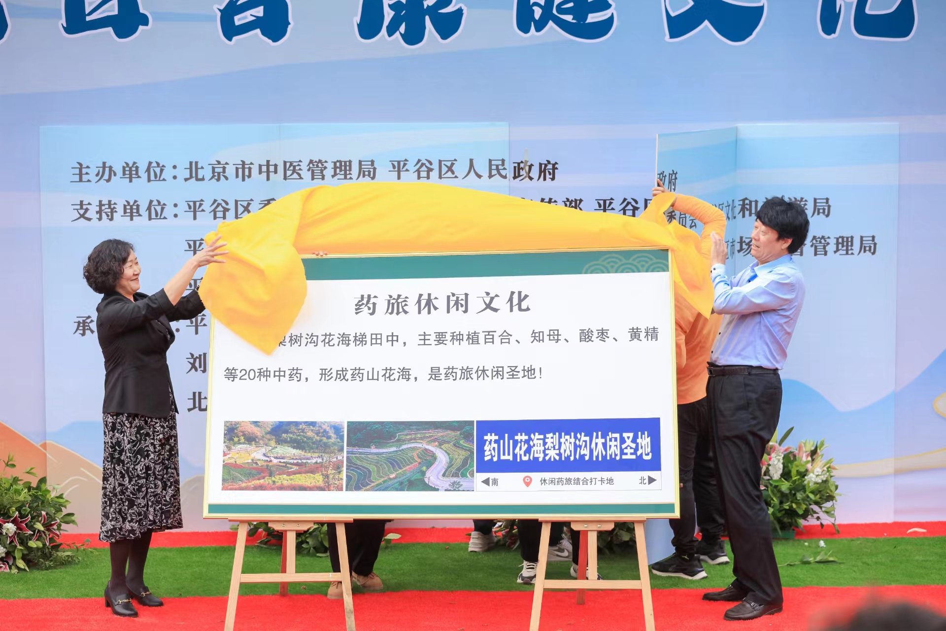 平谷区卫健委党委书记曹玉敏、梨树沟休闲谷董事长安满一起为药旅休闲文化揭牌,并对药旅休闲文化建设情况进行介绍。