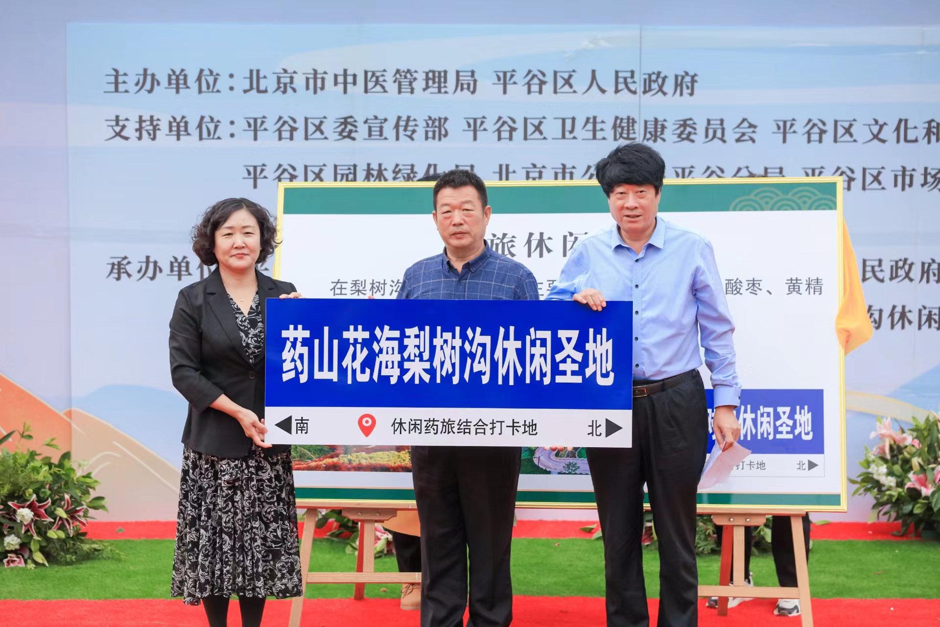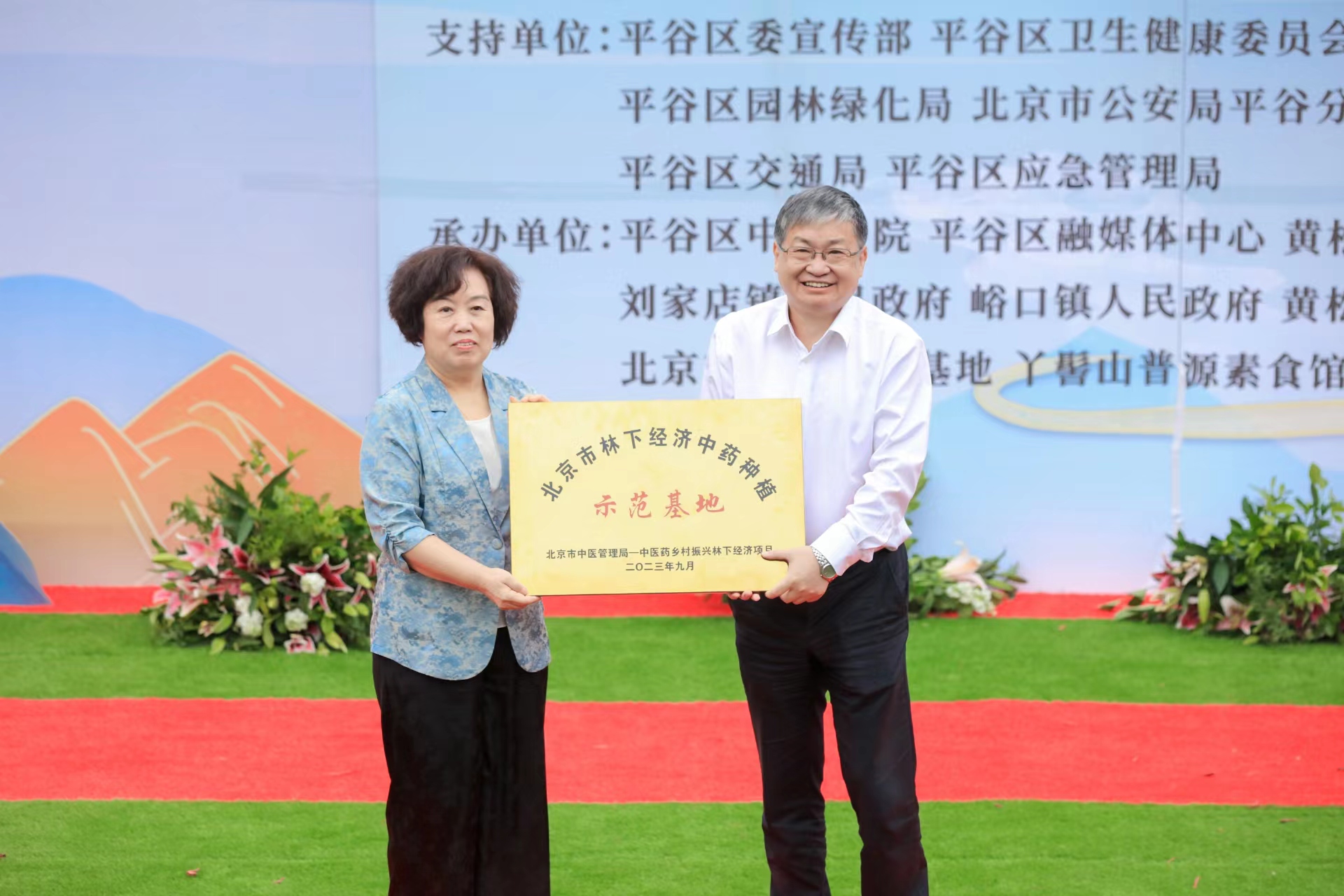 区委宣传部分管日常工作副部长马思亿为平谷区“药旅文化基地、康养文化基地——药山花海梨树沟”授牌。