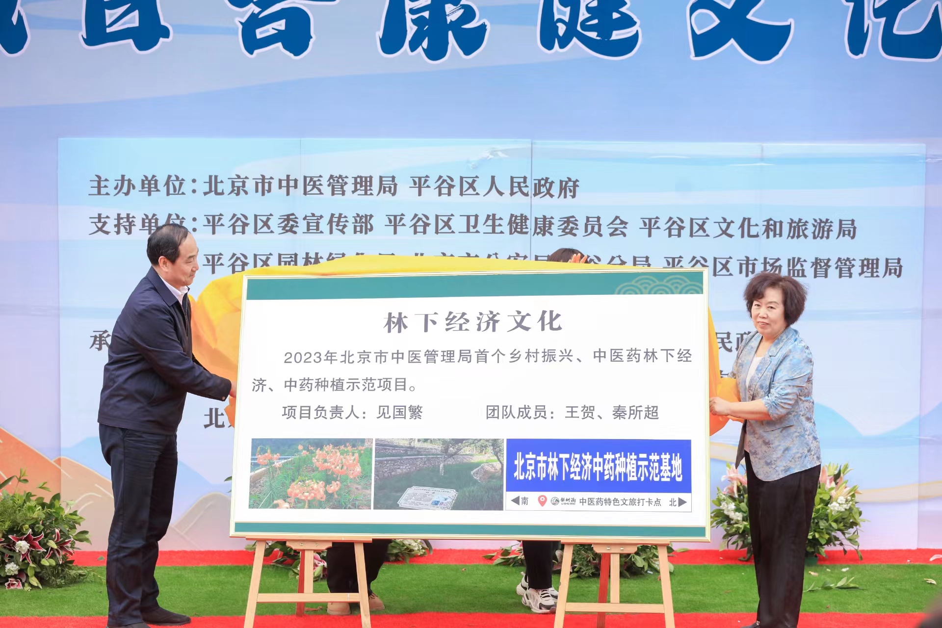 区园林绿化局局长于清德、平谷区中医医院党委书记见国繁一起为林下经济文化揭牌,并对林下经济文化建设情况进行介绍。