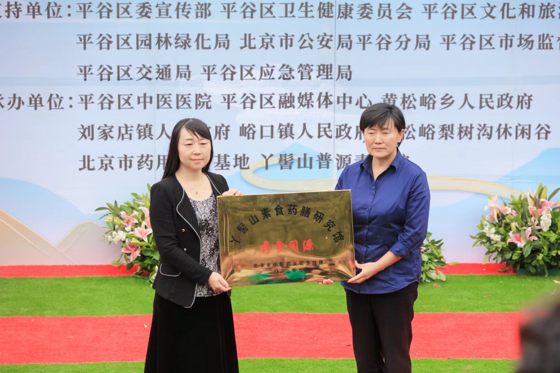 平谷区副区长马冬梅为平谷区“药食同源文化基地——丫髻山素食药膳研究馆”授牌。