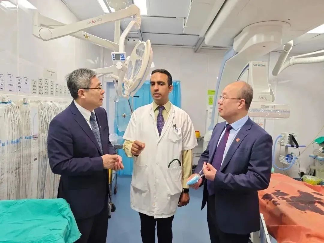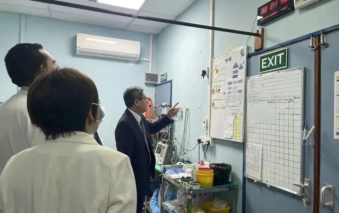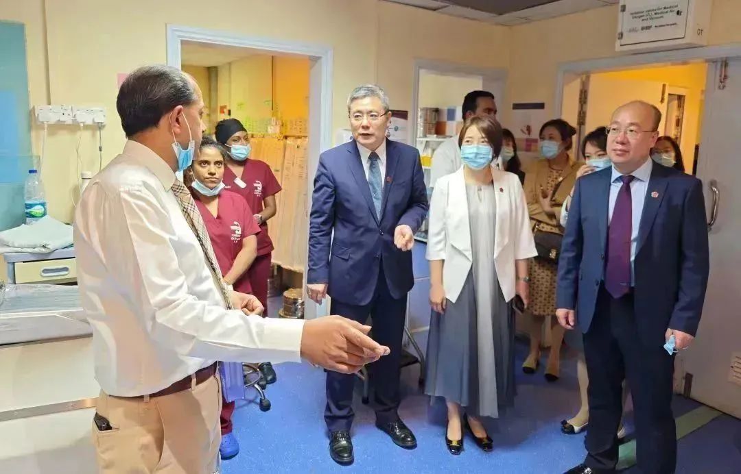 会谈结束后,访问团参观了医院门急诊、手术中心楼(中国援建)、麻醉科、心内科病房、导管室、神经外科病房、ICU、NICU、移植病房等,并与当地医务人员进行深入交流。