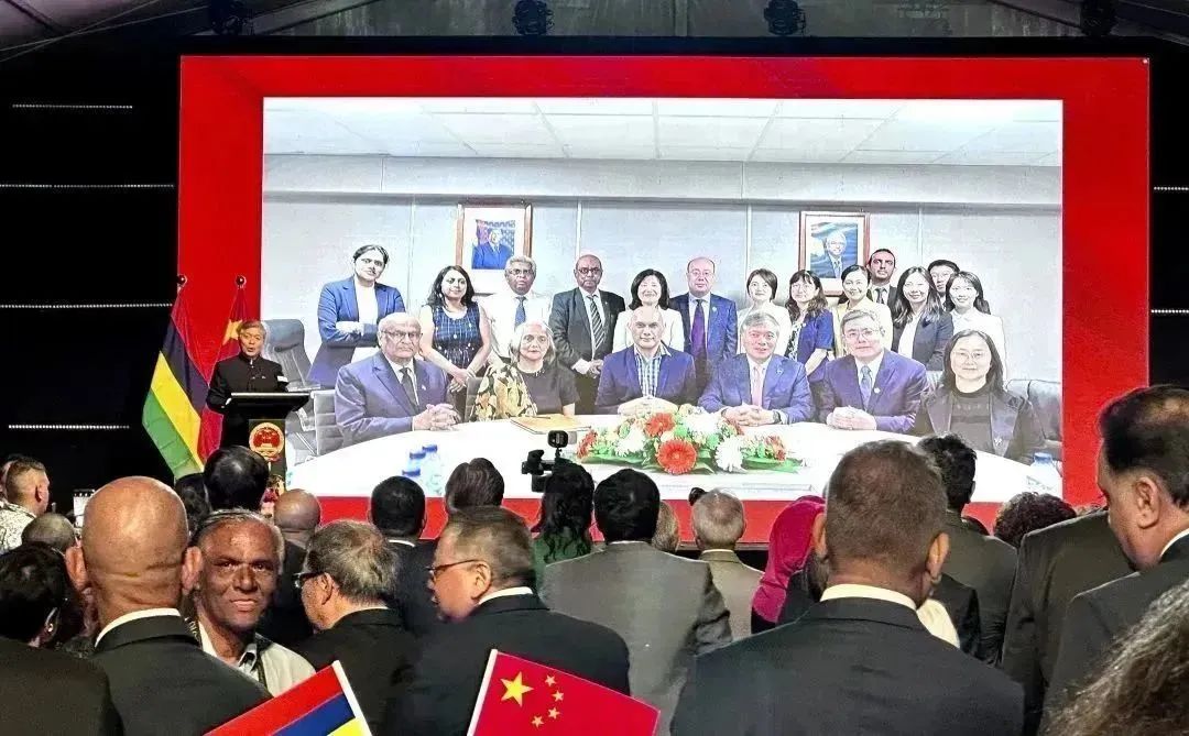 访问团在毛里求斯实地调研期间,正值中秋节和国庆节前夕,28日晚上,代表团受邀参加了我国驻毛里求斯大使馆举行的庆祝中华人民共和国成立74周年招待会。毛代总统马利·西里·艾迪·博塞仁(Marie·Cyril·Eddy· Boissézon)、总理普拉温德·库马尔·贾格纳特(Pravind·Kumar·Jugnauth)等政要,毛各界友好人士,各国驻毛使节和国际组织代表,在毛中资机构、华侨华人代表等约600人出席。